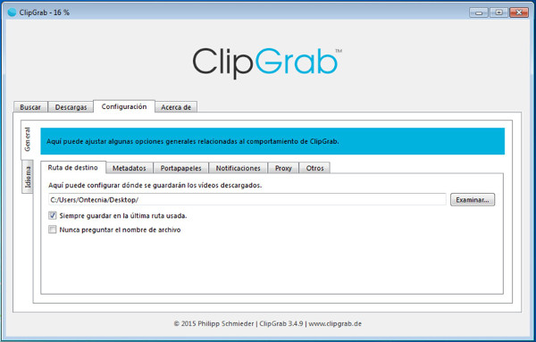 Рубрика «Установка» содержит настройки прокси и для управления ClipGrab. Здесь можно назначить папку загрузки, поставить отметку об уведомлении окончания процесса, добавить метаданные или удалить сведения о ролике сразу после закачки.
