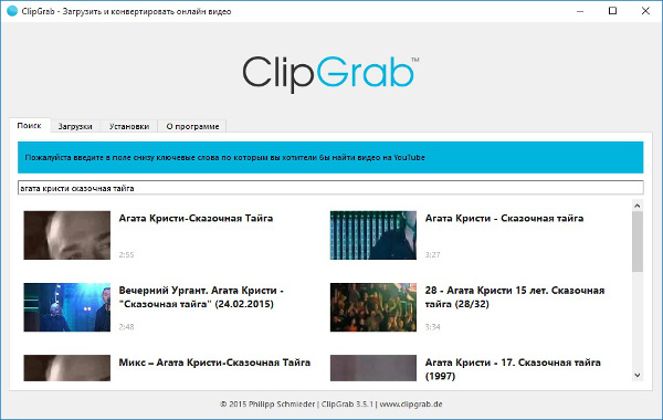 ClipGrab — это программа для скачивания видео из интернета, используется для загрузки файлов с Vimeo, YouTube, Dailymotion и подобных ресурсов. Поисковая строка для ввода целевого названия интегрирована прямо в приложении. Дополнительно юзер может добавить в буфер ClipGrab URL интересующего видеоролика, чтобы увидеть превью и знать — ПО обработает нужный клип. Скачать Клип Граб на русском языке можно на этой странице.